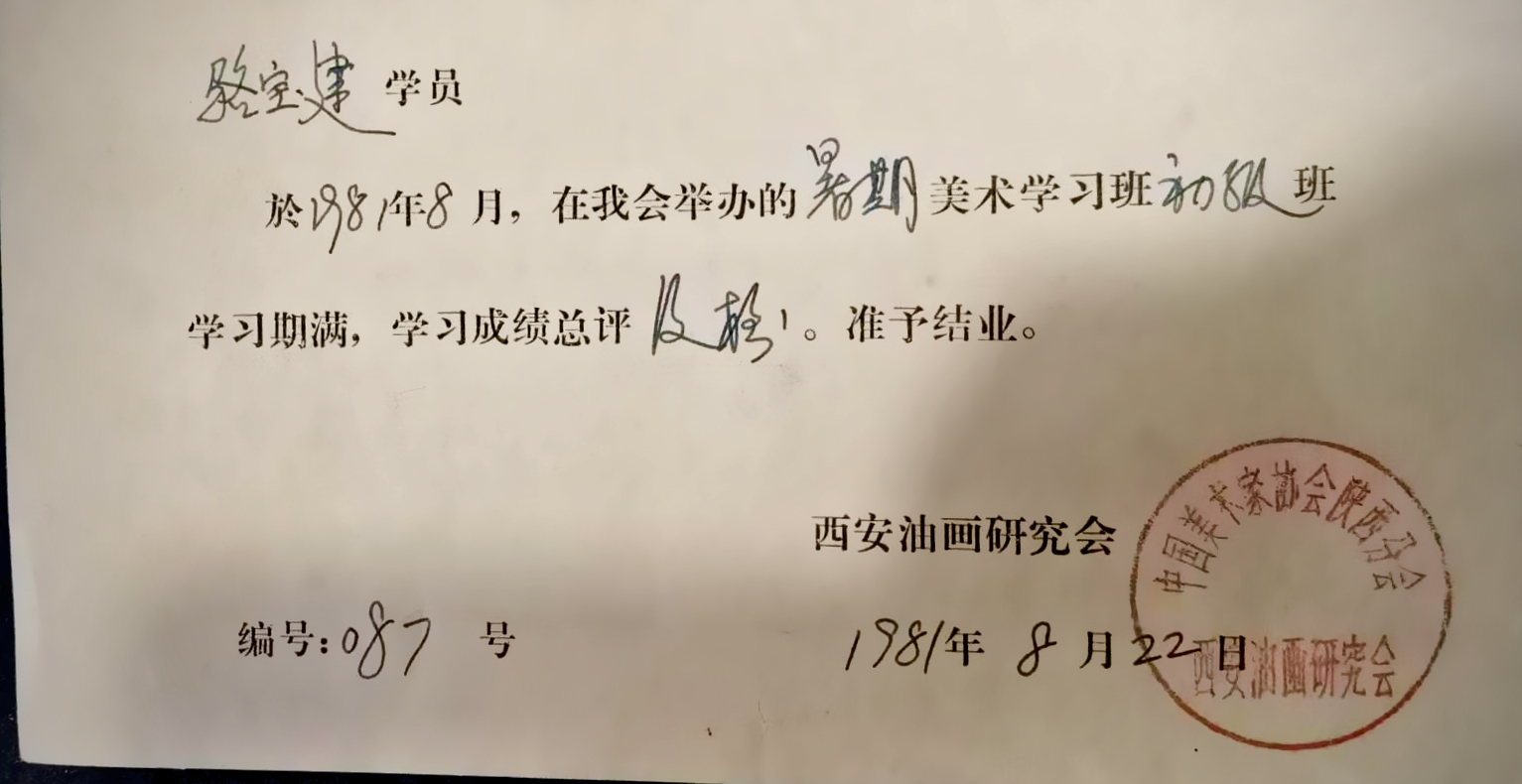 荣获西安油画研究会初级班毕业,获中国美术家协会、陕西分会西安油画研究会毕业证书