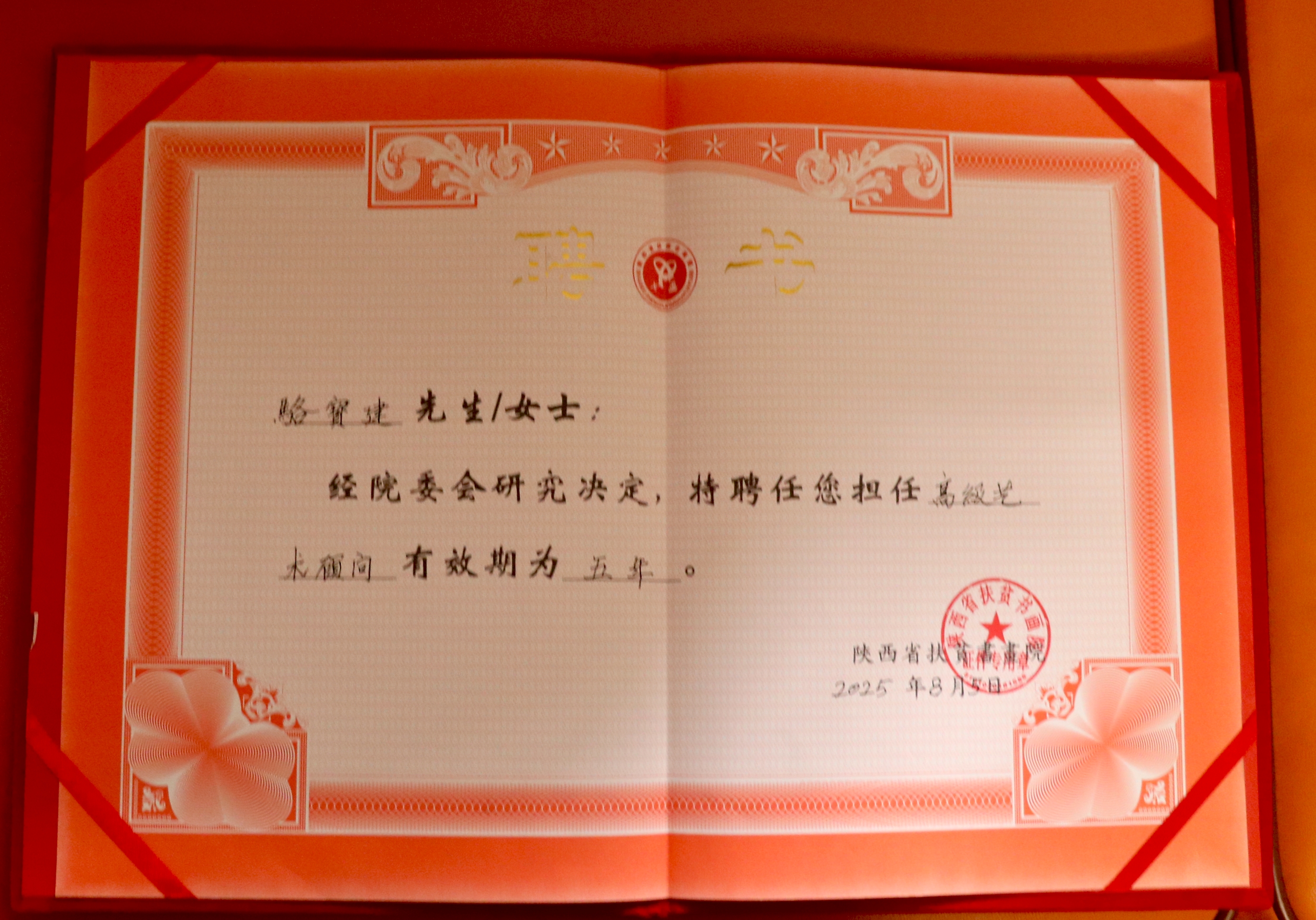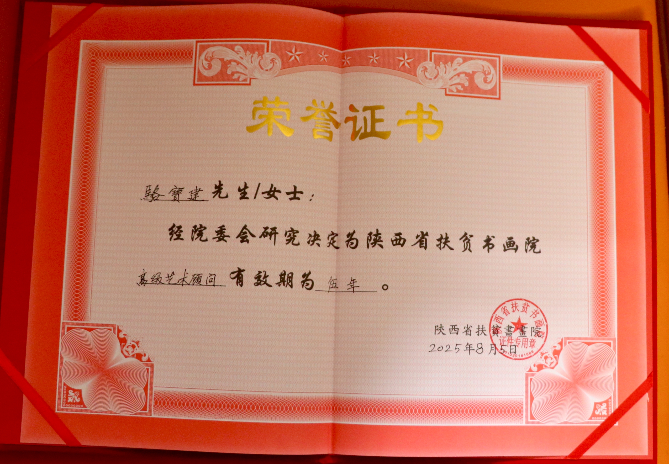 荣获陕西省扶贫书画院高级艺术顾问聘书及证书
