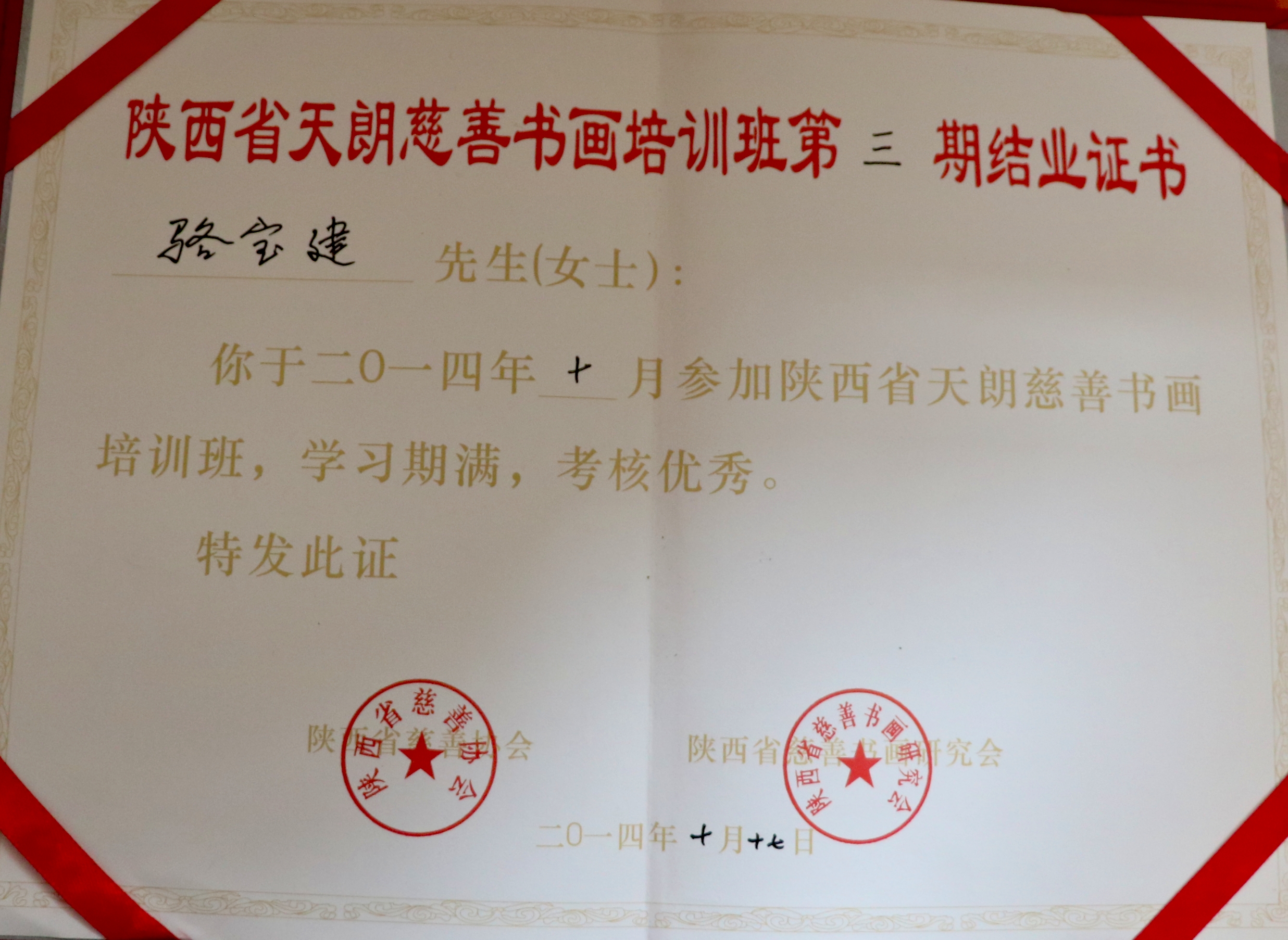 荣获陕西省天朗慈善书画培训班证书
