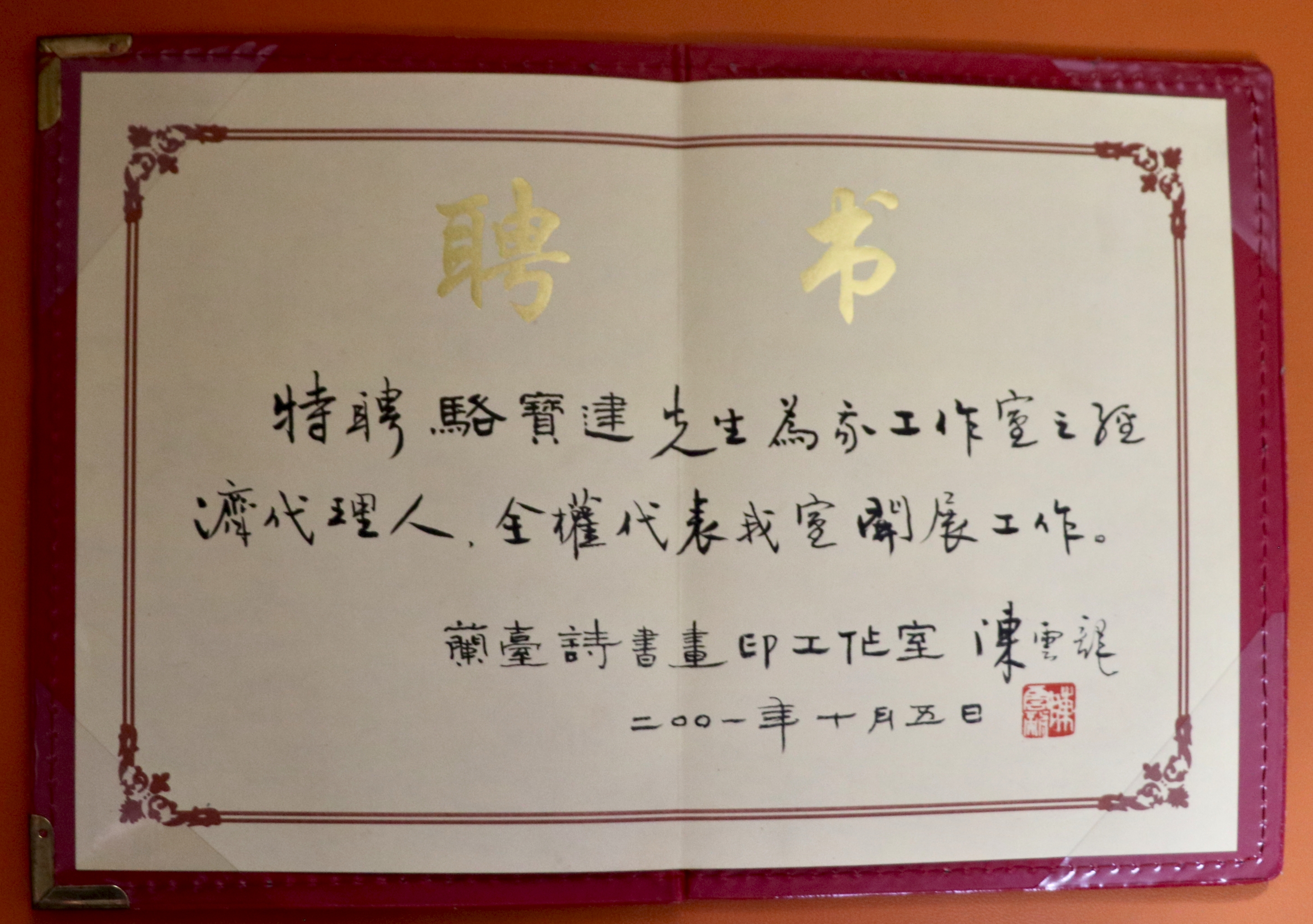 荣获陈云龙书画经济代理人(全权代表工作室开展工作)证书及聘书